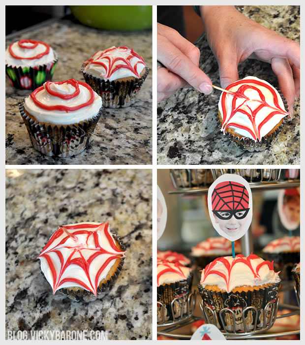 Thanks for the easy directions for cute Spiderman cupcakes. I made these for my daughter’s superhero themed party. I liked the look of the cupcakes with 3 rings instead of 2 for the web. Definitely need a clean toothpick for each cupcake to get a nicer look. The kids loved them! Thanks for posting!