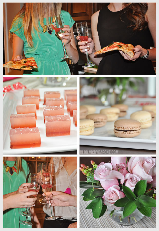 We dropped a few frozen raspberries in our champagne to keep it chilled and make it fancy! Then we ordered pizza delivery to bring us back down to earth. We also made some jello shots from scratch, and picked up some fresh flowers and frozen macarons from the grocery store. Mixing homemade with store-bought is a great way to make an easy and pretty party come together.
