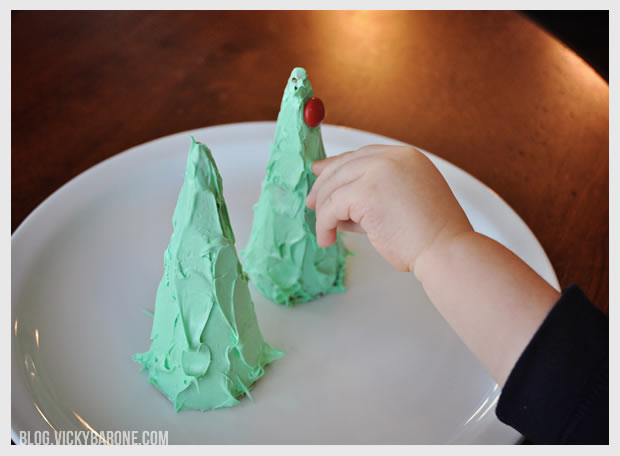 Materials: Ice cream cones, white icing, green food coloring, m&ms, red and green sprinkles, coconut, marshmallows, and any other treats you’d like to add!