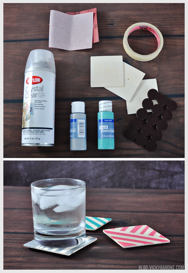 Materials: unfinished wood squares, sandpaper, masking tape or painter’s tape, acrylic paint, acrylic sealant, and felt pads.