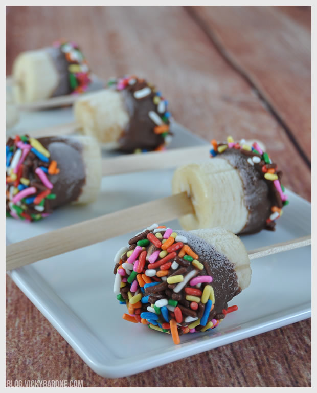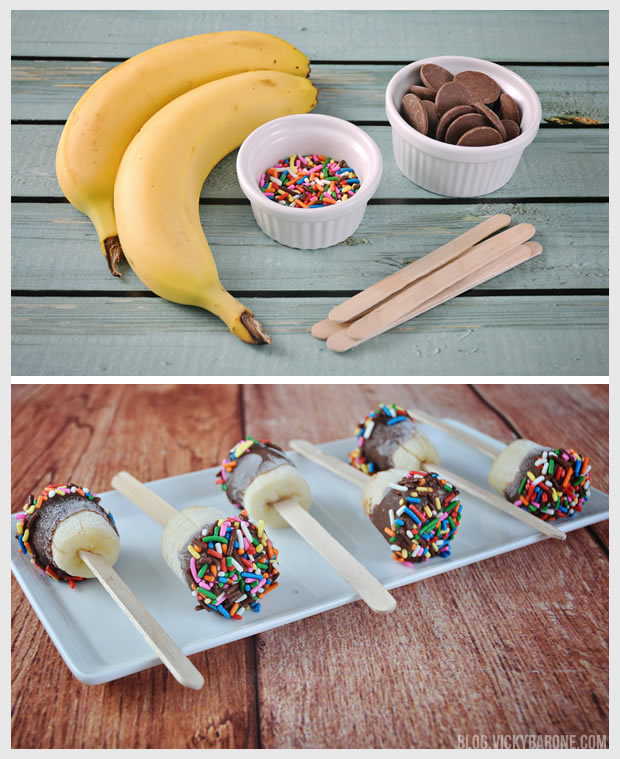 Ingredients: ripe bananas, melting chocolate, sprinkles, and Popsicle sticks.