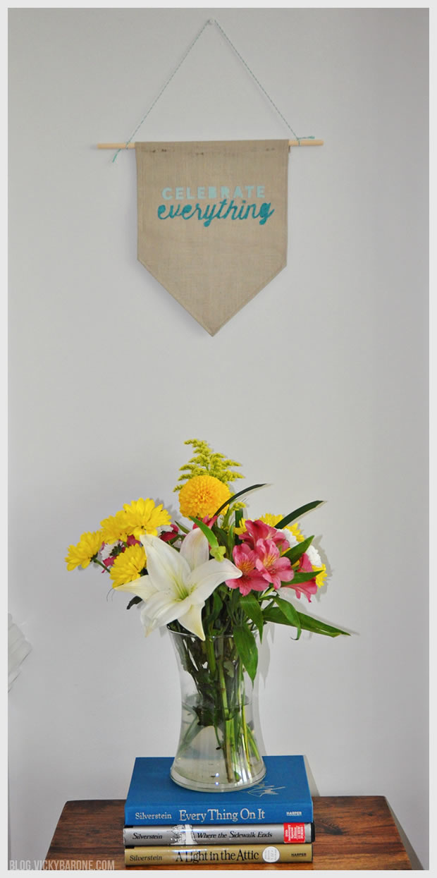 This is one of our favorite DIY projects we’ve done for the blog: an inspirational banner to hang on the wall! We used some discount fabrics from the remnants bins at Joann’s and my motto: “Celebrate Everything” to create this happy banner. We are so pleased to share it with you today.