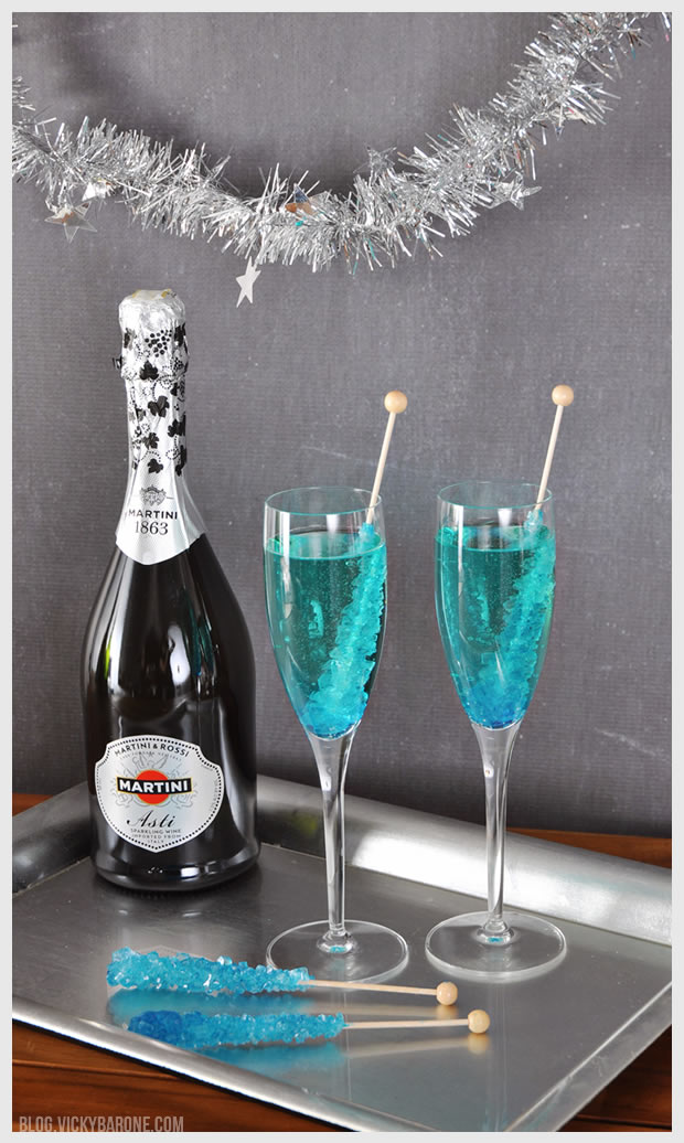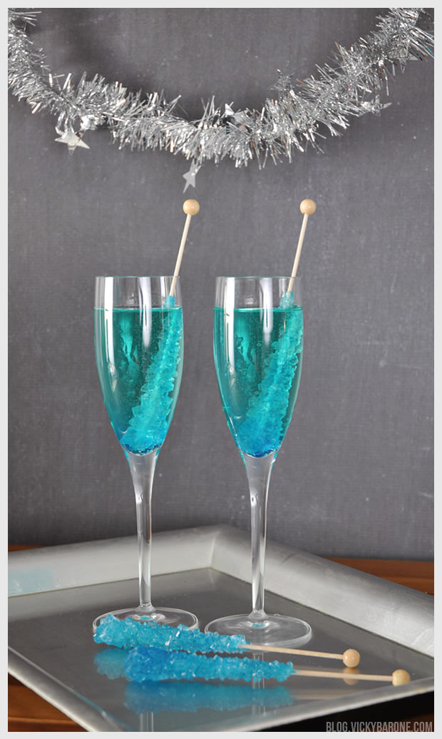 On your designated cocktail table or bar cart, place a tray of champagne glasses and a bottle of bubbly. Put a stick of rock candy into each glass and let your guests do the rest! We used blue rock candy, but any color will do! The clear rock candy makes an extra classy look while still being sweet and fun.