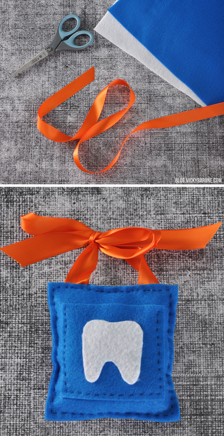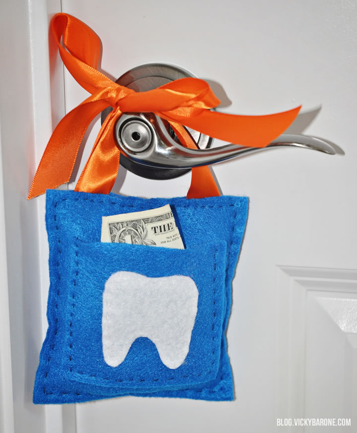 Hang your darling pillow on the door with the tooth in the front pocket and wait for the tooth fairy to come. She is sure to appreciate the gesture (and won’t mind skipping the under-pillow digging 😉 ).