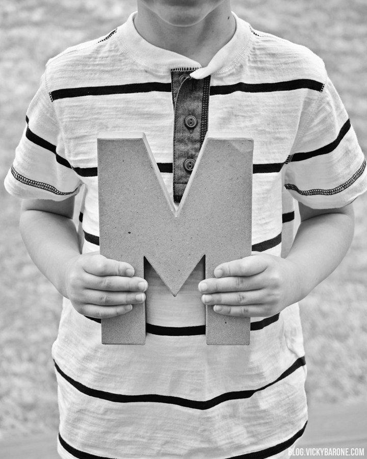 I brought my three sweet boys to the backyard and took a picture of each of them holding a letter. As you can see above, even Cooper did an excellent job modeling.