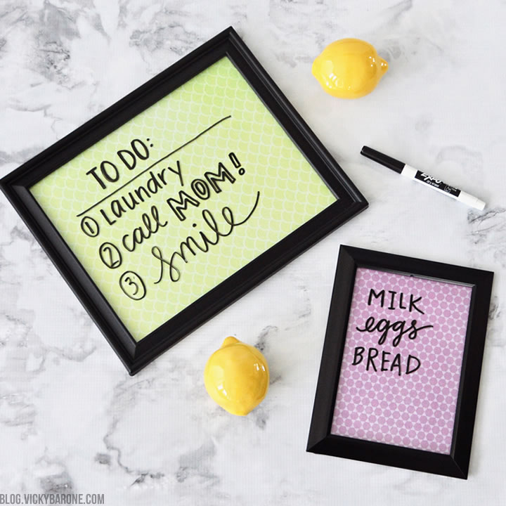 You only need two things to create these dry erase boards: a frame (with glass), and a piece of scrapbook paper.