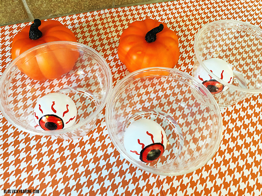You can use a Sharpie to draw eyeballs on regular ping pong balls, or spring for these: